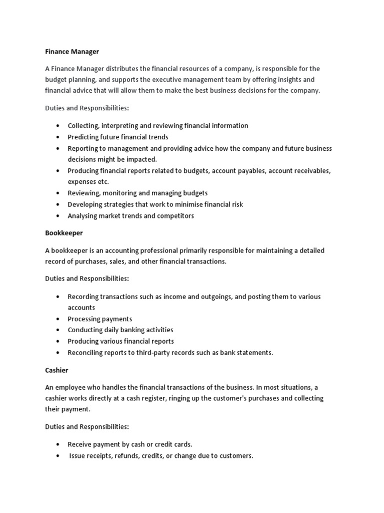Duties Of A Finance Manager In An Organisation Financeviewer from image.slidesharecdn.com They often have the following duties: The registered office is rosebery house, 9 haymarket place, edinburgh eh12 5ez Overseeing and managing all aspects of the finance department. Finance managers are in charge of overseeing an employing company's operating expenses, which includes analyzing how spending is taking place through each of the company's departments to determine whether the company is on pace to meet its financial goals. Infuse your company's personality into the description, but keep everything straightforward and succinct to keep the reader engaged. Finance managers are accounting professionals who are responsible for the financial wellbeing of a company or organization. Career information at a glance auto finance managers work in car dealerships and are responsible for helping customers find financing solutions, securing rates, and communicating to banks about loans and other financial matters. Ensures business processes, administration, and financial management.